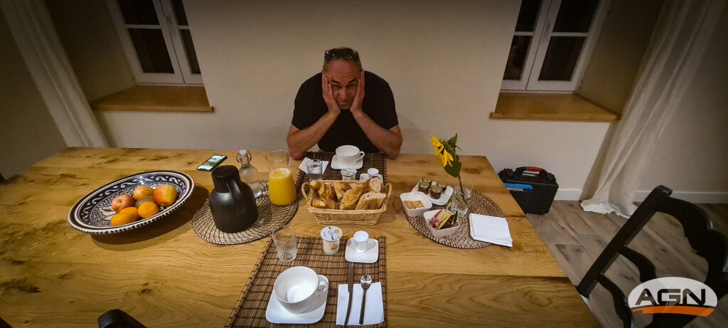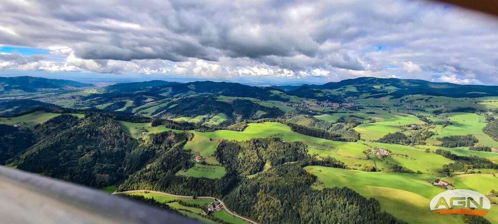 Tak už nic nebrání ve středu přespat na letišti a ve čtvrtek brzy ráno vyrazit. Od nás na jih je škaredě a jedna fronta za druhou a takto má být i celý zbytek týdne tady. Stejně jako loni v tuto dobu, tedy letíme do Francie přes Německo, to znamená tankování v Hosíně. Volám cestou Blance (šéfová na letišti) a zapomenu se zeptat, jestli je vidět špička kostela od věže. Pokud by nebyla, není letovo. My ale máme štěstí a za Železnou Rudou už se dostáváme i mimo nízké mraky a od teď už nás bude doprovázet hlavně sluníčko. A většinu cesty i vítr do zad. Za 4 hodiny jsme pohodlně ve Francii v Belfortu (LFGG). Tady už máme tankování a cestu na benzinku zmáknutou, takže ještě popoletíme k Lionu na hezké (ale prázdné) letiště mezi Feurs a Chambeon LFLZ. V Chambeon se ubytujeme. Jako obvykle nám to zajistí strýček booking. Při výběru hraje hlavní roli, jestli je u penzionu parkoviště pro vírníky a výhoda, pokud se dají nabíjet baterky na pojezd někde v suterénu a nemusíme nechat hučet nabíječky v pokoji. Jak budeme spát my, není tak podstatný parametr. Pokud není na výběr, snášíme s Matúšem i manželskou postel. Tady to ale dovedli k dokonalosti. Úzká postel s jednou přikrývkou (Slávek Janoušek slovy písně Byla to jízda“ spát na motorku tomu říkali“) ještě vylepšená o sprchu za prosklenou stěnou přímo naproti postele. Jinak v dědině chcípl pes a jediná restaurace je tady společná s obchůdkem, kterému šéfuje docela prima borec. K ginu s tonikem (zasloužený po celém dni a osmi hodinách ve vzduchu) nám nakrájí klobásu. A když vidí, jak do nás vpadla, nabízí v zadní malé restauraci večeři speciálně pro nás. Už vím, co jsou to lukulské hody. Po několika chodech a před závěrečným zákusečkem výborná láhev červeného vína jeho dvorního dodavatele. Spokojení se odkutálíme do postele.