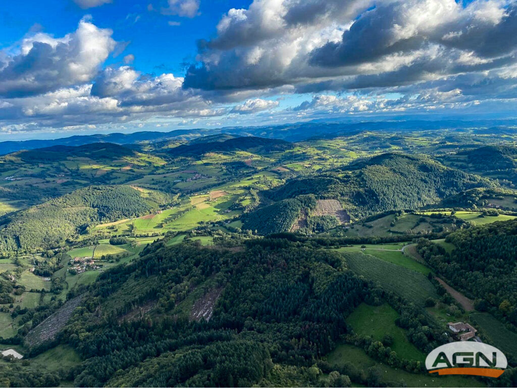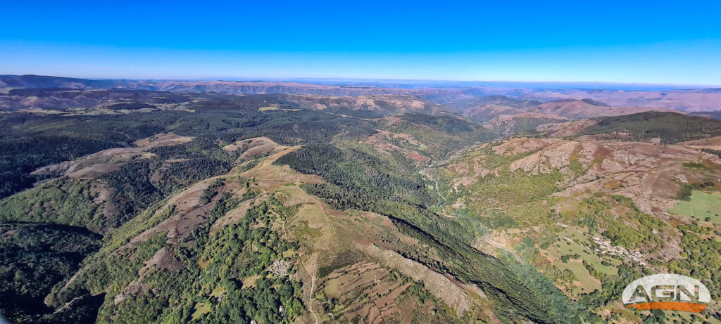 Hory na západě a osamělá stavení kam vedou úzké cesty lesem do kopce.