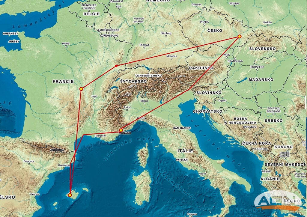 Celkem přes 4000 Km a téměř 30 hodin letu. Trasa vedla přes Německo, Francii a Španělsko, zpátky potom Itálie Rakousko.